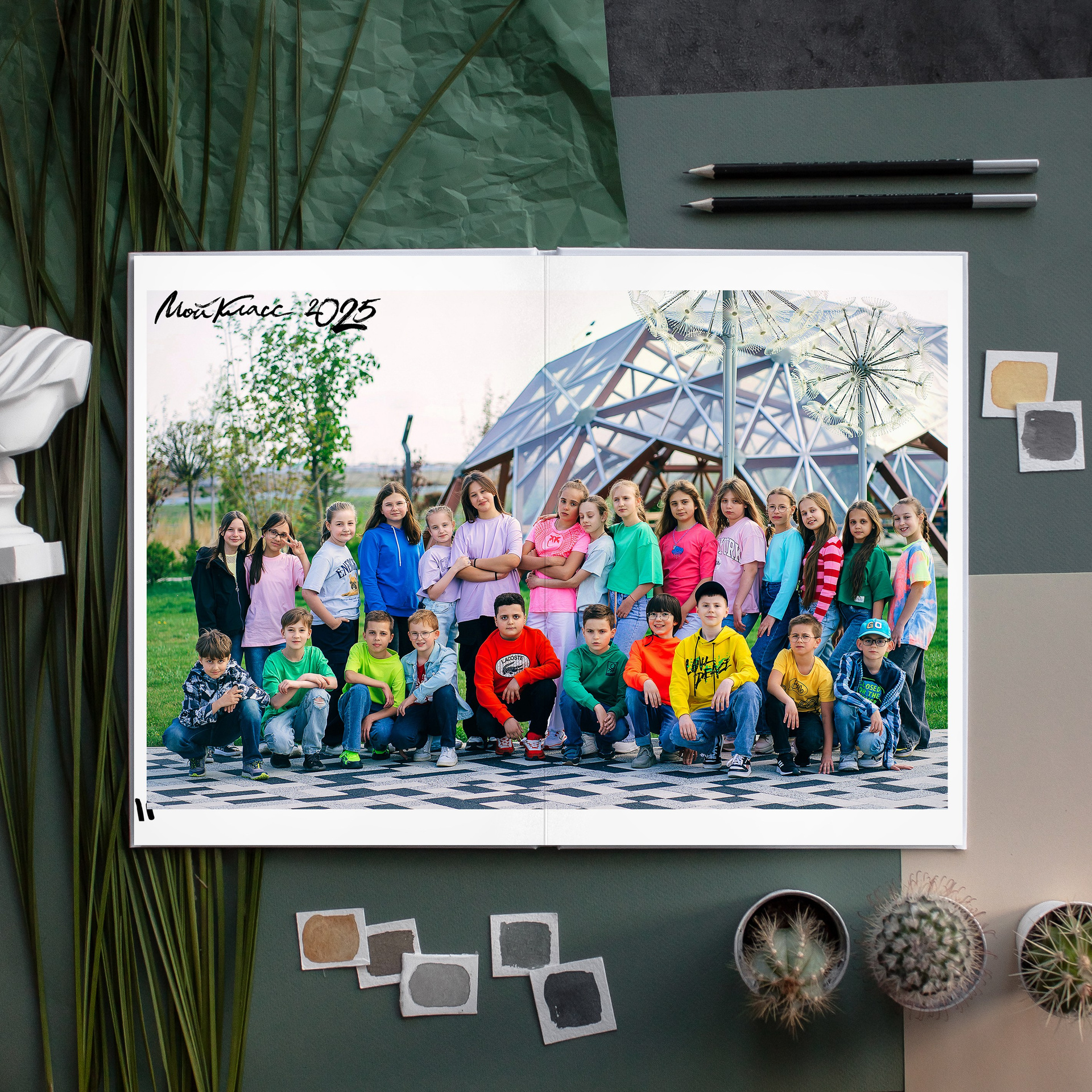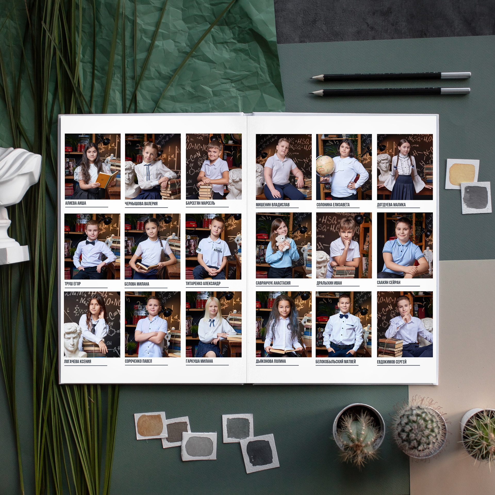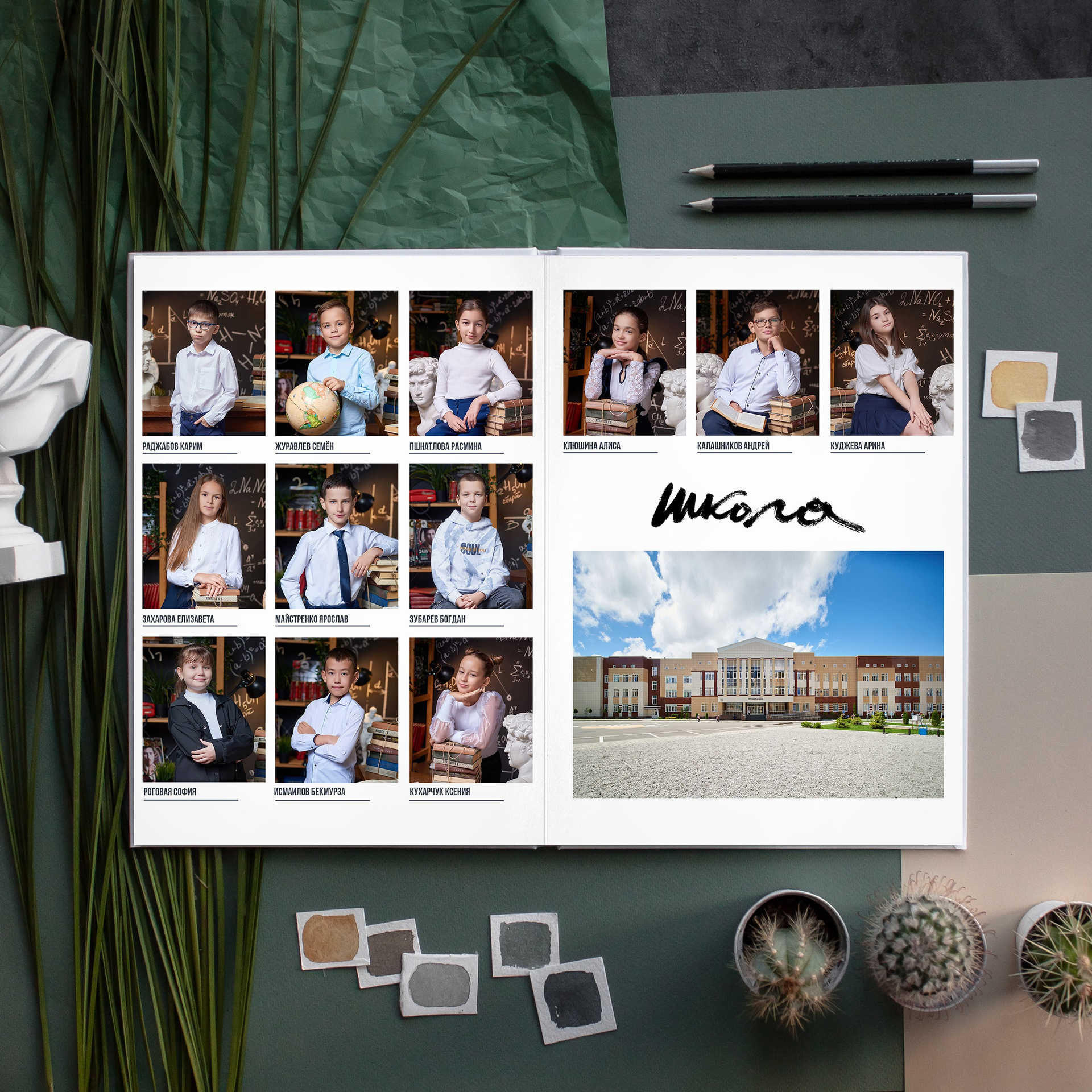 В нем 8 твердых разворотов (что ровняется 16 страницам), проводим портретные фотосессии в студии или школе и одну групповую на природе. Владелец альбома либо на обложке, либо внутри на развороте.