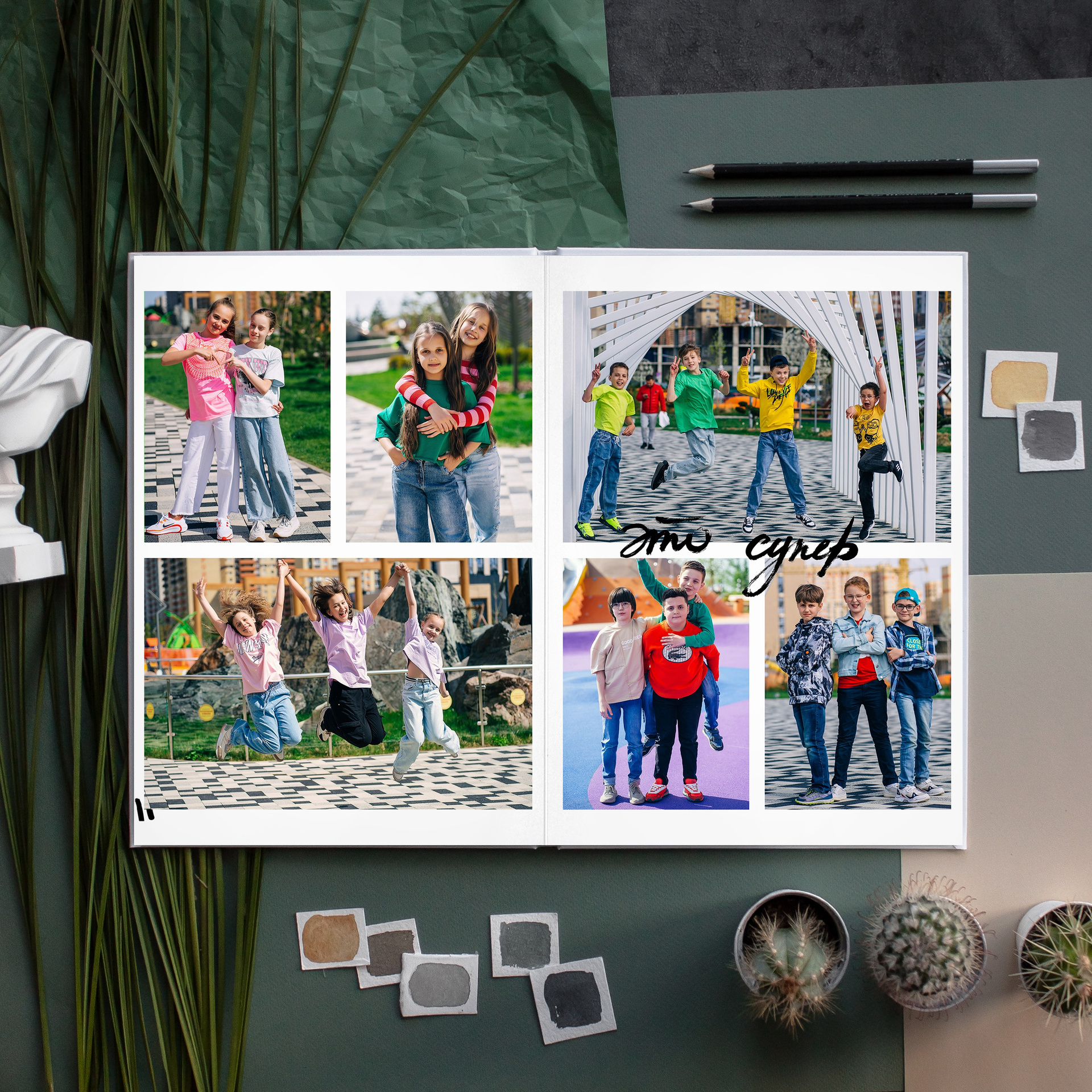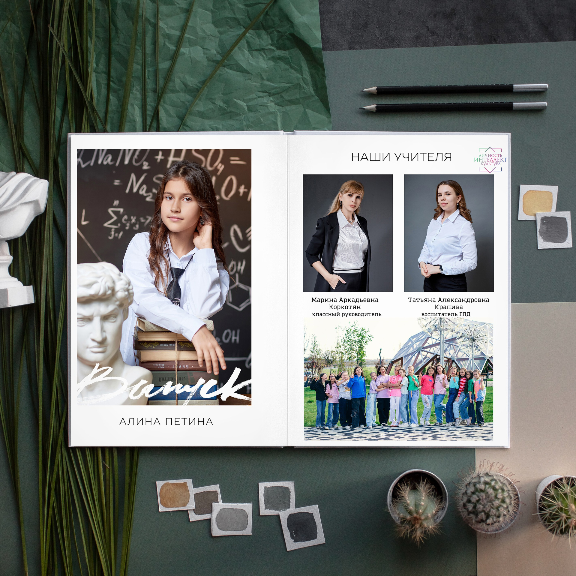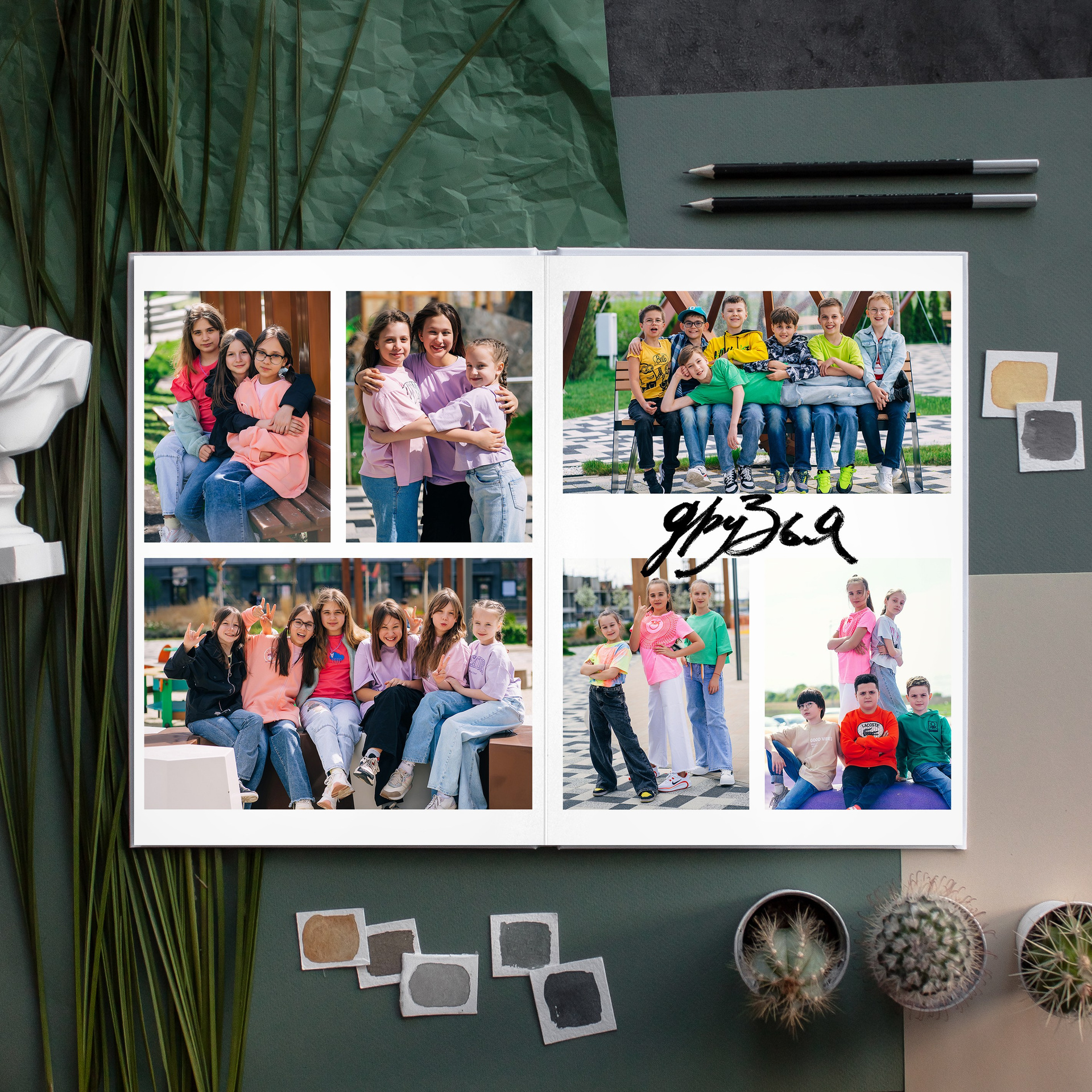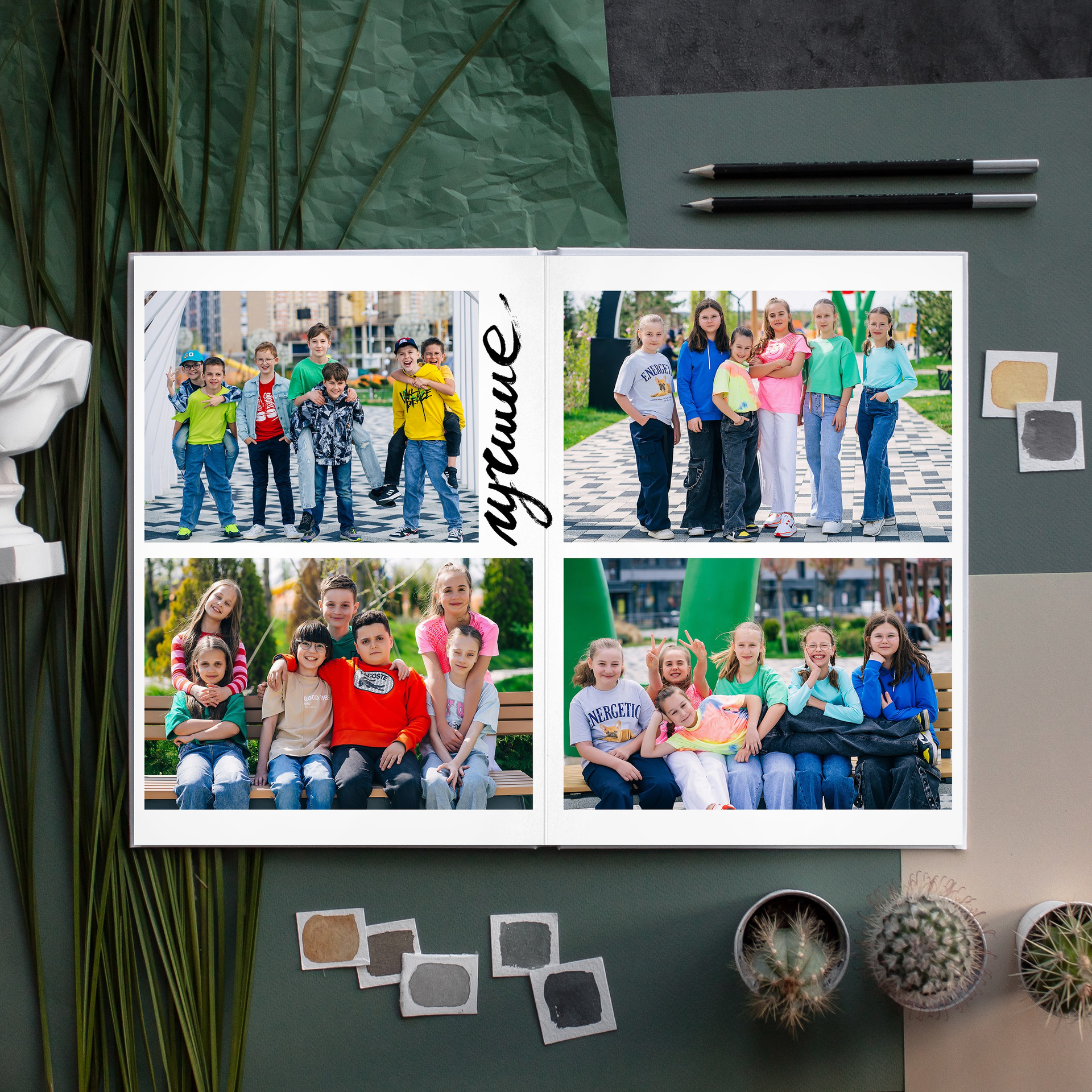 В нем 8 твердых разворотов (что ровняется 16 страницам), проводим портретные фотосессии в студии или школе и одну групповую на природе. Владелец альбома либо на обложке, либо внутри на развороте.