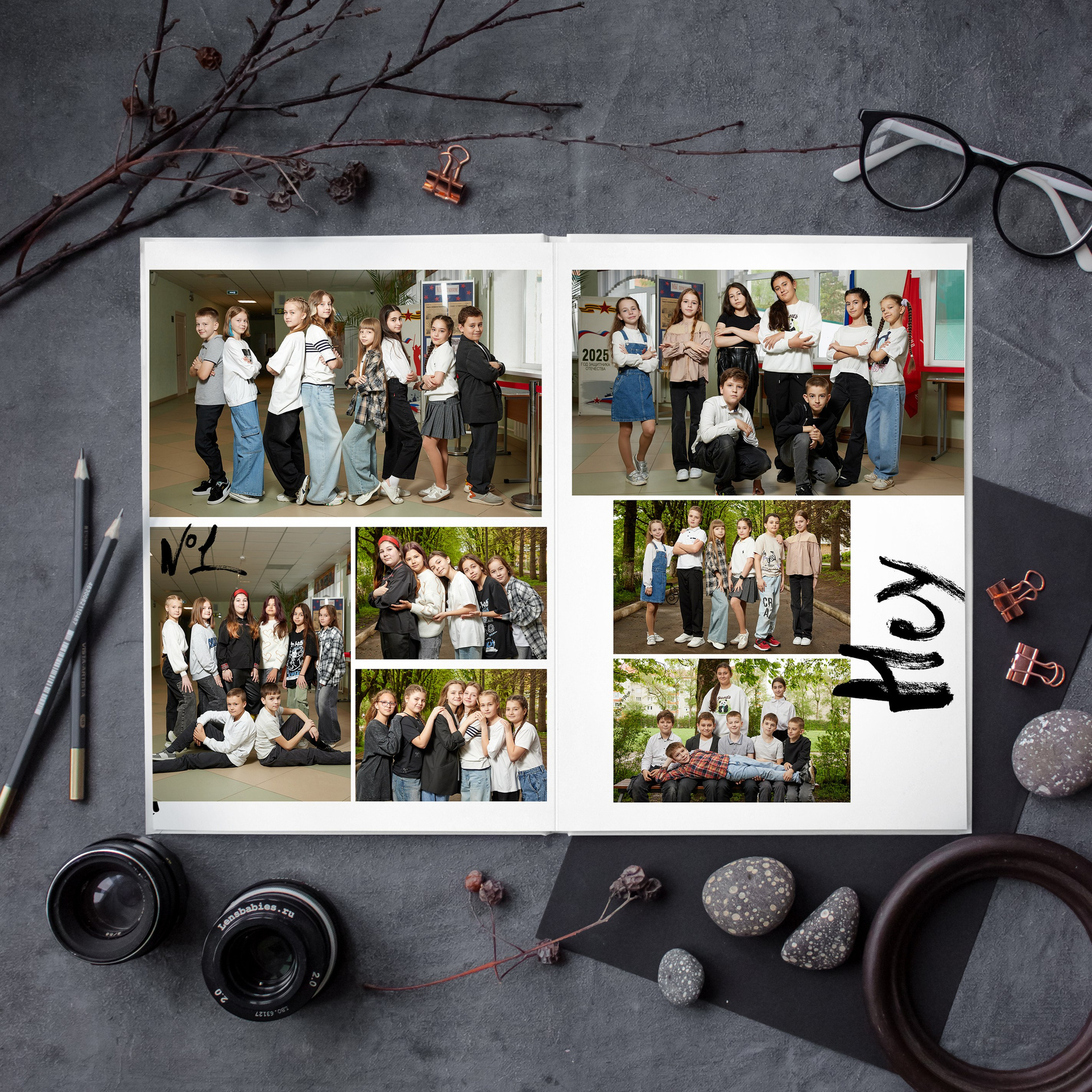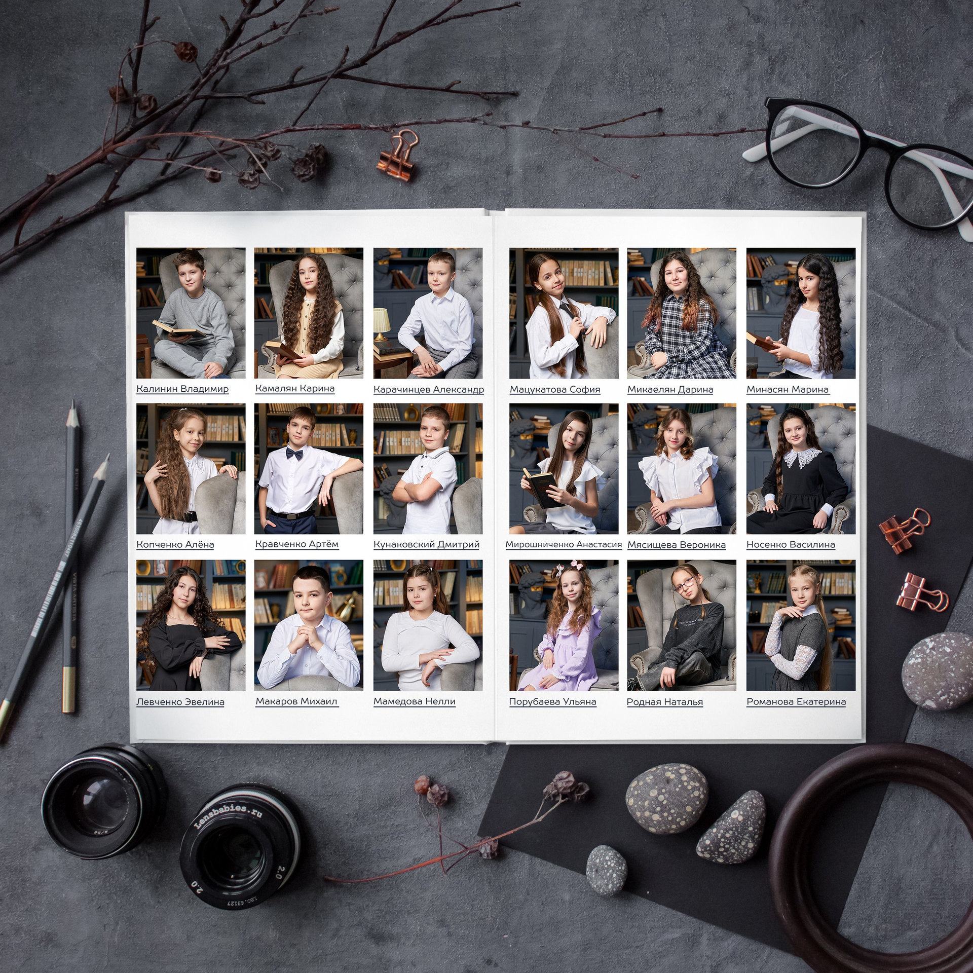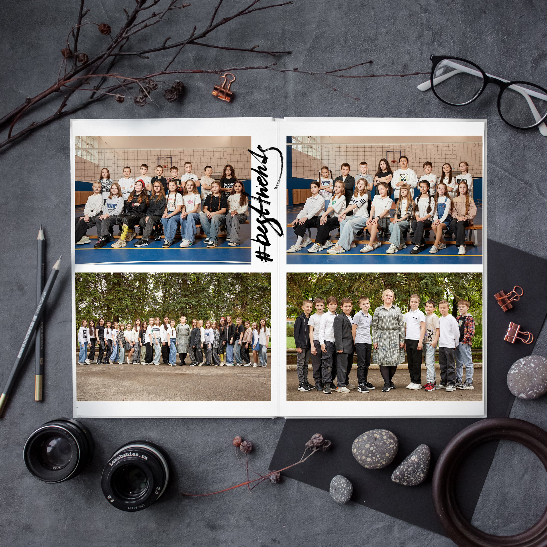 Самый выбираемый альбом для 4 класса. В нем твердая обложка и 10 твердых страниц.Все портреты снимаются в школе или студии (по выбору родителей), одна групповая фотосессия делается в фотостудии или на улице.